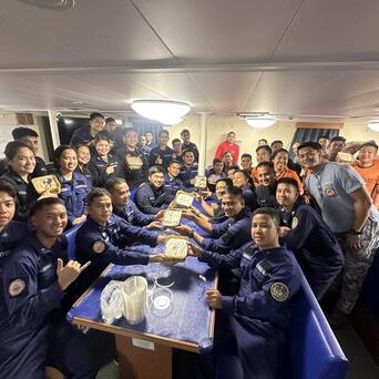 所以对于菲律宾在南海的种种行径,不要急,眼光真的要放长远。别看现在菲律宾在仙宾礁滞留的海警船上一派欢乐气氛,男女船员一边吃着甜品一边发朋友圈,将来有得是他们哭的时候。(图5。PS:图6为在仙宾礁海域的中国万吨海警船5901号,注意炮衣已经摘下。)